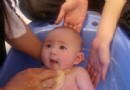 Step2:另一只手做成環狀,輕輕將澡盆的水淋在寶寶頭上,注意要避免將水濺到寶寶眼睛裡。