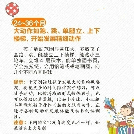 從呱呱墜地到牙牙學語,從蹒跚學步到活蹦亂跳,孩子的每次進步都給父母帶來驚喜。新手爸媽往往擔心,寶寶發育正常嗎?有沒有可參考的依據?如何培養孩子的動作能力?0到3歲,寶寶大動作自查表