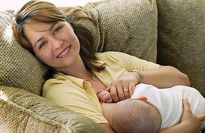 在分娩後的頭幾天,媽媽坐起來仍有困難,這時,以半躺式的姿勢喂哺寶寶便最為適合。把寶寶橫倚著媽媽的腹部,背後用枕頭墊高上身,斜靠躺臥。