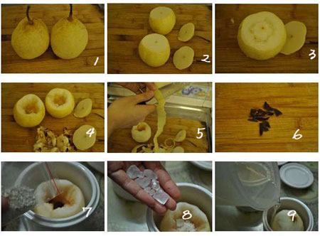 步驟:1.雪梨清洗干淨,在蒂部往下三分之一處切開,上蓋放一邊,下部用水果刀尖先畫好一個圓形,然後慢慢沿著圓形挖下去,把梨心小心掏出來,形成一個梨盅,削皮。2.把搗碎好的川貝小塊、冰糖放入、切好絲的陳皮放入雪梨盅內,蓋回上蓋,用牙簽固定好梨蓋,放入炖盅內,加適量的水,隔水炖2小時即可。