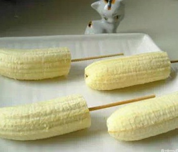 做法:用那種熟透的非常甜的香蕉,切段(如果有合適的竹簽也可以用整個香蕉),插上牙簽,放冰箱冷凍。