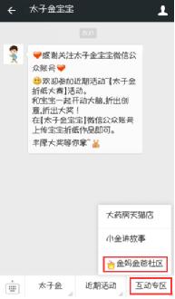 1、關注“太子金寶寶”微信公眾賬號,點擊【互動專區】進入【金媽金爸社區】;