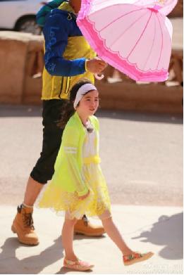 美麗的公主夏天,外穿防曬服,還有胡“護衛”貼身打傘,俨然公主巡視的陣勢,而且亮色的衣服本來就有助於防曬,原來是有備而來,怪不得小公主這麼堅強,沒有因高溫和暴曬而顯出絲毫不快。