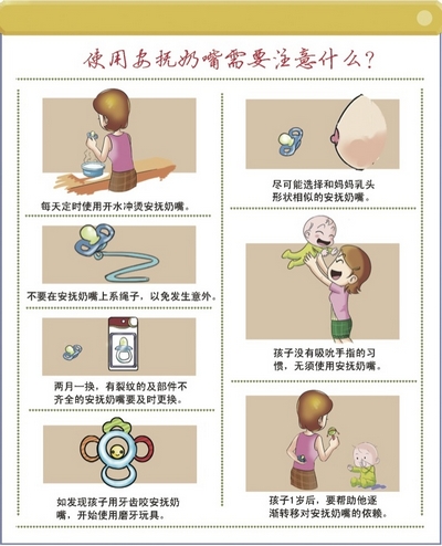 如果孩子喜歡午睡和晚上睡覺時使用安撫奶嘴並且很難讓他放棄這種習慣,可以等到孩子稍大點再讓他改掉這個習慣,最高不能超過2歲。如果2歲還不能改掉吸吮安撫奶嘴的習慣,可以采用“強制”的方法——在更換環境下,比如外出旅游、回姥姥家居住等,安撫奶嘴“突然”消失。雖然安撫奶嘴突然消失的頭幾天可能會造成孩子一定的不安,但還是比較容易過渡的,家長不需擔憂。
