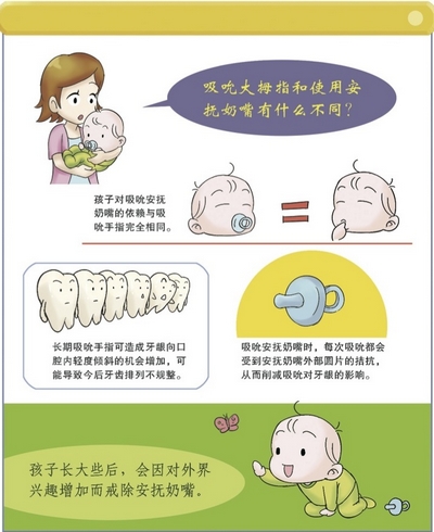 重要的是要讓孩子正確使用安撫奶嘴,安撫奶嘴由盲端奶頭和扁片組成。盲端奶頭可以防止孩子吞咽進較多的空氣,而扁片可以通過反作用力的方式緩解孩子吸吮造成對牙齒和牙龈的影響。吸吮手指和吸吮安撫奶嘴相比,吸吮手指對牙齒的影響更為嚴重。盡量讓孩子在1歲以後不要再使用安撫奶嘴,家長可以為他選擇其他的安慰物。